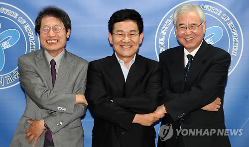 | △ 한자리 모인 조희연, 문용린, 고승덕 (서울=연합뉴스) 한상균 기자 = 조희연 서울시교육감 당선자와 문용린 교육감, 고승덕 후보가 26일 오후 서울시교육청에서 공동기자회견 후 포즈를 취하고 있다. 이들은 "서울교육의 혁신과 학생들의 안전과 행복을 위해 협력해 나가기로 합의했다"고 밝혔다. 2014.6.26 xyz@yna.co.kr |