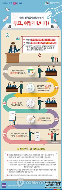| △ '전국동시조합장선거' 투표 절차 (서울=연합뉴스) 김재홍 기자 = 오는 11일 진행되는 '전국동시조합장선거' 투표 절차. 사상 첫 전국동시조합장선거는 오는 11일 오전 7시부터 오후 5시까지 농·축협 1천115곳, 수협 82곳, 산림조합 129곳 등 1천326곳에서 일제히 치러진다. 선거권자는 280만 명 가량 된다. (중앙선관위 제공) |
