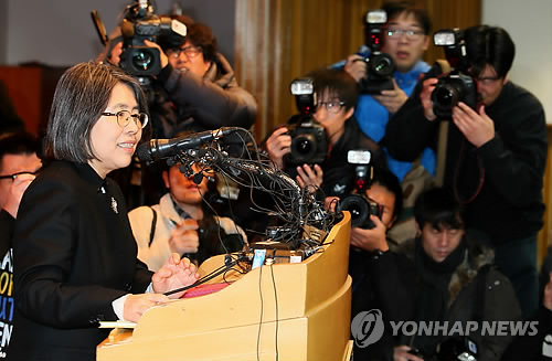 | △ 김영란 기자회견 (서울=연합뉴스) 박지호 기자 = 김영란 전 국민권익위원장이 국회가 처리한 김영란법이 졸속입법 및 위헌논란을 빚는 것과 관련해 10일 오전 서울 신수동 서강대학교 다산관에서 기자회견을 하고 있다. |