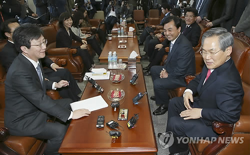 | △ 주례회동하는 여야 원내대표 (서울=연합뉴스) 진성철 기자 = 새누리당 유승민 원내대표(왼쪽)와 새정치민주연합 우윤근 원내대표 등이 10일 국회 운영위원장실에서 주례회동하고 있다. |
