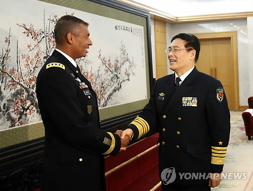 | △ 지난 1월 중국을 방문한 빈센트 브룩스 미국 태평양 육군사령관(왼쪽) (EPA=연합뉴스) |