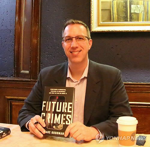 | △ 미국의 사이버 보안 전문가이자 미래 범죄 이론가인 마크 굿맨이 10일 시카고 국제문제협의회(CCGA) 초청 강연회에 이어진 북사인회에서 저서 '미래 범죄'를 들고 포즈를 취했다. 2015.3.11 chicagorho@yna.co.kr |