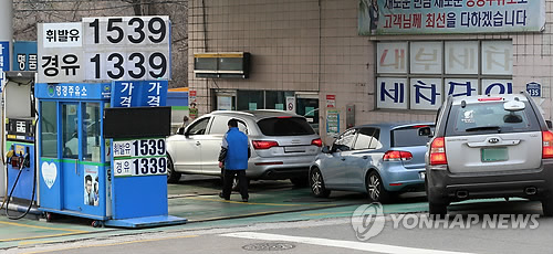 | △ 주유소 휘발유 평균값 ℓ당 1천500원대로 올라 (서울=연합뉴스) 최재구 기자 = 8일 서울 종로구 한 주유소에서 차량이 주유하고 있다. 전국 1만2천여개 주유소의 휘발유 평균값은 한 달 동안 매일 상승해 ℓ당 1천500원대로 올라섰다. 8일 유가정보시스템 오피넷에 따르면 주유소 휘발유 평균값은 오후 3시 기준 ℓ당 1천500.2원으로 집계됐다 2015.3.8 jjaeck9@yna.co.kr |