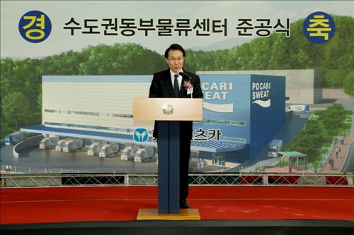 | △ 10일 경기도 광주에서 열린 동아오츠카 동부물류센터 준공식에서 2018 물류전략을 발표하는 이원희 사장 |
