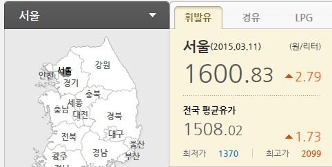 서울 휘발유 값은 전국적으로 가장 저렴한 경북 평균값(1천478.8원)보다 ℓ당 122원 비싸고, 전국 평균값(1천508.0원)보다는 92.8원 비싸다.
