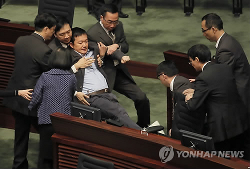 | △ 끝나지 않은 홍콩의 갈등 (AP=연합뉴스) 친(親)민주주의 계열의 레이먼드 찬 홍콩 의원이 14일(현지시간) 입법회(국회 격)에서 렁춘잉 행정장관(행정수반)의 연례정책발표가 진행되는 도중 항의시위를 벌이다 경비요원들에게 끌려 나가고 있다. marshal@yna.co.kr Pro-democracy legislator Raymond Chan is taken away by security guards after he protested against Hong Kong Chief Executive Leung Chun-ying during Leung's annual policy address in Hong Kong, Wednesday, Jan. 14, 2015. (AP Photo/Vincent Yu) |
