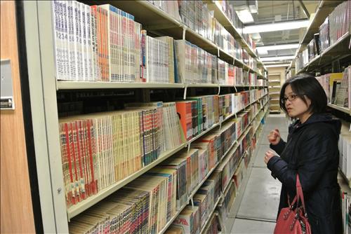 | △ 미국 워싱턴대 한국학도서관에 소장된 한국만화 1만5천 권을 둘러보는 이효경 한국학도서관 사서. |