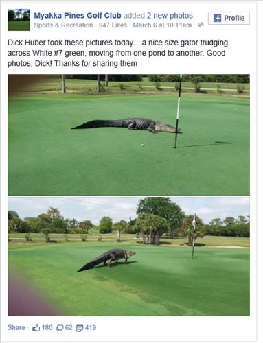 11일(현지시간) ABC 방송 등 미국 언론에 따르면, 지난 7일 미국 플로리다 주 잉글우드의 미야카 파인스 골프장에서 골프를 즐기던 딕 허버와 빌 수지는 난데없이 출현한 악어 한 마리의 행동을 찍어 SNS에 올렸다.