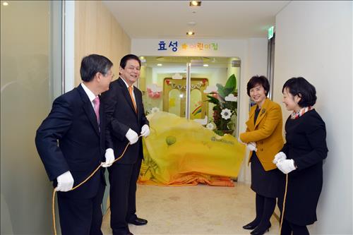 | △ 효성이 이상운 부회장(왼쪽 두번째), 장형옥 지원본부장(부사장?왼쪽 첫번째), 푸르니보육지원재단 김온기 상무(오른쪽 두번째)가 참석한 가운데, 마포 본사 4층에 어린이집 개원식을 열고 현판식을 가졌다. |