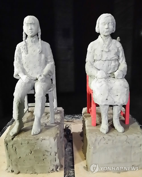 | △ 나란히 앉은 한국·중국 위안부 소녀상 (부산=연합뉴스) 일본군 위안부로 끌려간 한국과 중국의 소녀를 형상화한 동상이 부산에 함께 전시된다. 사진은 소녀상 모형도. 2015.3.12 << 부산 평화의 소녀상 유치 추진위원회 >> wink@yna.co.kr |
