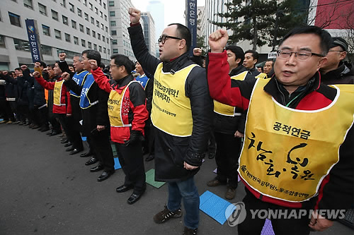 | △ '공적연금 지켜내자' (서울=연합뉴스) 박지호 기자 = 29일 오후 서울 여의도 새누리당사 앞에서 열린 '연금특위 구성 여야 야합 규탄 공적연금강화를 위한 공동투쟁본부 간부 결의대회'에서 참가자들이 구호를 외치고 있다. 2014.12.29 jihopark@yna.co.kr |