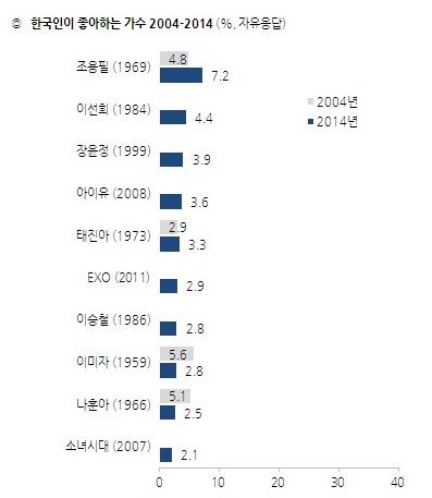 활동분야별로 나눠 보면 가수 중에는 '가왕' 조용필에 이어 이선희(4.4%), 장윤정(3.9%), 아이유(3.6%), 태진아(3.3%), 엑소(2.9%), 이승철(2.8%), 이미자(2.8%), 나훈아(2.5%), 소녀시대(2.1%) 순으로 좋아하는 것으로 조사됐다.