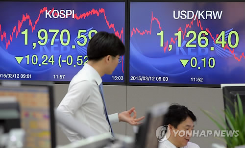 | △ 코스피 나흘째 하락 (서울=연합뉴스) 이정훈 기자 = 코스피는 12일 한국은행의 기준금리 인하 결정에도 하락으로 마감했다. 이날 코스피는 전날보다 10.24포인트(0.52%) 내린 1,970.59, 원·달러 환율은 0.1원 내린 1,126.4원으로 마감했다. 사진은 이날 서울 명동 외환은행 본점 딜링룸. |