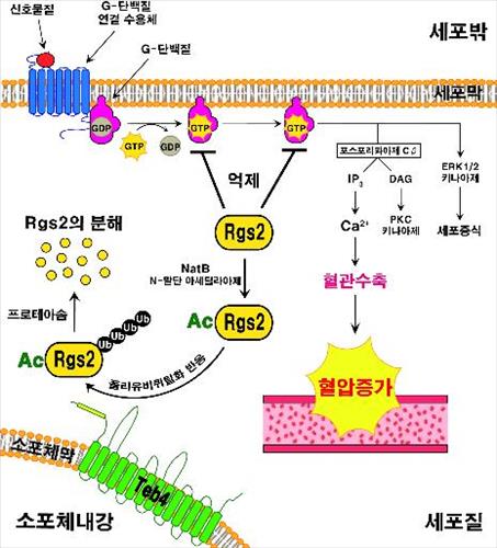 | △ 혈압 조절에 중요한 G단백질 신호전달 조절인자인 Rgs2 분해 과정. 외부 신호물질들은 G단백질 신호전달 과정을 통해 혈관을 수축시켜 혈압을 상승시키지만 Rgs2는 활성화된 G단백질을 제어, 혈관을 이완시켜 혈압을 감소시킨다. 이 연구에서 Teb4라는 유비퀴틴 결합효소가 Rgs2 단백질 분해에 관여, 세포 내 Rgs2 농도에 영향을 미침으로써 혈압 조절에 중요한 역할을 한다는 사실이 밝혀졌다. |