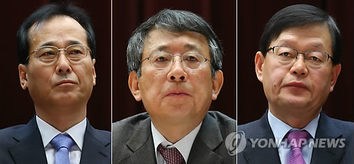 | △ 현대차 주총 (서울=연합뉴스) 김도훈 기자 = 13일 오전 서울 서초구 현대자동차 사옥에서 열린 제 47기 정기주주총회에서 사내이사로 재선임된 윤갑한 사장(왼쪽)과 신규 사외 이사로 선임된 이동규 전 공정거래위원회 사무청장(가운데), 이병국 전 서울지방국세청장이 각각 자리에서 의장의 인사말을 듣고 있다. |
