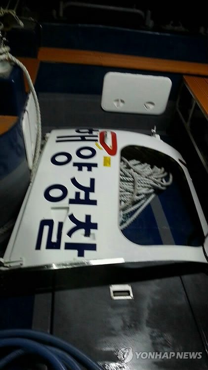 | △ 가거도 헬기 추락현장서 발견된 잔해 (신안=연합뉴스) 박철홍 기자 = 13일 오후 전남 신안군 가거도 인근 해상에서 해경 B-511 팬더헬기가 추락해 탑승자 4명의 생사가 불투명하다. 사진은 추락 직후 수색작업에서 발견된 사고 헬기의 탑승문. |