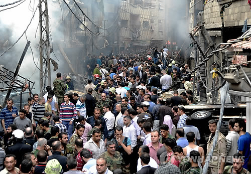 | △ 시리아 수도 다마스쿠스의 마제흐 알 자발 지구에서 폭발사건이 발생해 수명이 숨지거나 다쳤다. 사건 직후 현장에 많은 사람들이 몰려있다. (AP=연합뉴스 자료사진) |