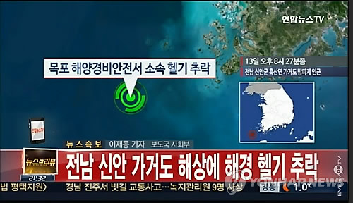 (신안=연합뉴스) 조근영 장아름 기자 = 악천후 속에 섬 지역 응급환자를 이송하기 위해 착륙을 시도하던 서해해양경비안전본부 헬기가 바다에 추락했다.