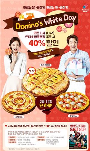 (서울=연합뉴스) 김아람 기자 = 도미노피자는 화이트데이를 맞아 14일 하루 동안 인터넷 방문포장 주문 고객을 대상으로 전 메뉴를 40% 할인 판매한다.