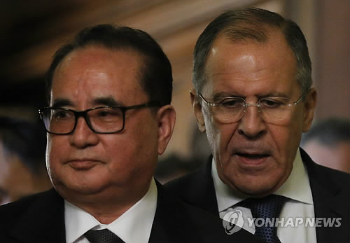 | △ 리수용 북한 외무상(왼쪽)과 세르게이 라브로프 러시아 외무장관 (EPA=연합뉴스) |