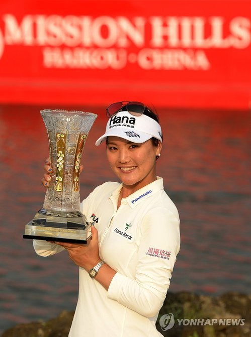 | △ 유소연이 15일 중국 하이난성 하이커우 미션힐스골프장 블랙스톤코스에서 열린 LET 월드 레이디스 챔피언십에서 최종합계 13언더파 279타로 우승을 차지한 후 우승 트로피를 들고 기념촬영을 하고 있다. |