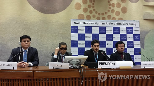 | △ 북한 인권단체 NK워치 기자회견 (제네바=연합뉴스) 류현성 특파원= 북한 인권단체인 NK워치 안명철 대표(좌측)가 16일(현지시간) 스위스 제네바 유럽 유엔본부에서 마루즈키 다루스만 유엔 북한인권 특별보고관의 유엔 인권이사회 보고가 끝난 후 시베리아 벌목공 출신 김모씨(왼쪽 두번째), 북한인권실태를 다룬 영화 `겨울나비'를 감독한 김규민 감독 등과 기자회견을 하고 있는 모습. 2015.3.16 rhew@yna.co.kr |
