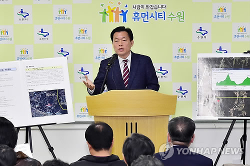 | △ 화장장 문제 설명하는 수원시 제2부시장 (수원=연합뉴스) 이재준 수원시 제2부시장은 17일 오전 시청 브리핑룸에서 화성종합화장장 건립에 따른 수원시 방안을 설명하고 있다. 2015.3.17 <<수원시 제공>> kcg33169@yna.co.kr |
