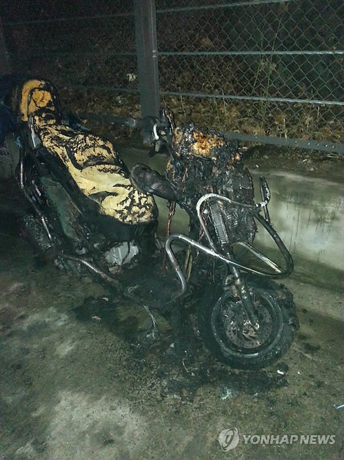 | △ 신림동 '연쇄방화' 공익요원이 불지른 오토바이 (서울=연합뉴스) 고은지 기자 = 지난해 12월부터 최근까지 서울 관악구 신림동 일대에서 발생한 방화 사건의 피의자인 이모(28) 씨가 불지른 오토바이. 17일 서울 관악경찰서에 따르면 관악구청 공익근무요원으로 복무 중이었던 이씨는 화가 나면 술을 마시고 범행을 저지른 것으로 드러났다. (관악경찰서 제공) |