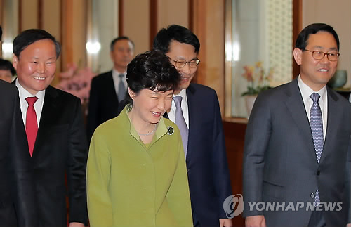 | △ 신임 정무특보단과 이동하는 박 대통령 (서울=연합뉴스) 이정훈 기자 = 박근혜 대통령이 지난 16일 오후 청와대 충무실에서 임명장·위촉장 수여식을 마친 뒤 신임 정무특보단과 이동하며 대화하고 있다. 오른쪽 부터 주호영 정무특보, 윤상현 정무특보, 박 대통령, 김재원 정무특보. |