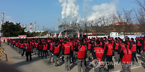 | △ '빅딜 반대' 삼성토탈 노조 대규모 집회 (서울=연합뉴스) 성혜미 기자 = 한화그룹으로의 매각반대 연대투쟁에 나선 삼성토탈·삼성종합화학·삼성테크윈·삼성탈레스 등 4개사 근로자들이 15일 정오부터 각사 공장 앞에서 동시다발 집회를 개최했다. 삼성토탈 노조원 650여 명이 충남 대산공장 앞에서 집회하고 있다. 2015.1.15 << 삼성토탈 노조 제공 >> noanoa@yna.co.kr |