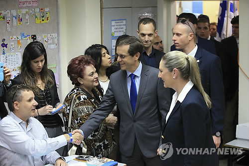 | △ 이' 시오니스트연합 '제1당' 예상 (AP=연합뉴스) 이스라엘과 팔레스타인 분쟁을 포함 중동 정세의 흐름에 큰 영향을 미치게 될 이스라엘 총선 투표가 17일 오전(현지시간) 전국 1만119개 투표소에서 일제히 시작됐다. 크네세트(이스라엘 의회) 의원 120명을 뽑는 이번 총선에 앞선 그동안의 여론조사에서 베냐민 네타냐후 총리가 이끄는 집권 리쿠드당은 20~22석을 확보, 2위로 밀려날 것으로 예측됐다. 사진은 24~26석을 얻어 제1당 지위에 오를 것으로 전망되고 있는 중도 좌파 시오니스트연합의 한 축인 노동당의 이삭 헤르조그 당수가 텔아비브 투표소에 도착해 관계자와 악수하는 모습. bulls@yna.co.kr (AP Photo/Ariel Schalit) |