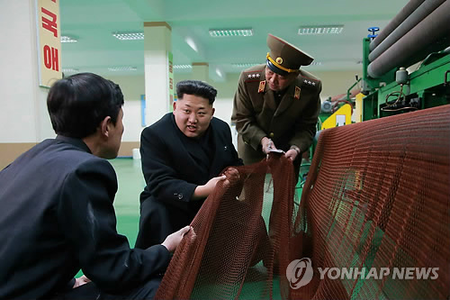 | △ 북한 김정은, 어구종합공장 시찰 (서울=연합뉴스) 북한 김정은 국방위원회 제1위원장이 새로 건설된 어구종합공장을 시찰했다고 조선중앙통신이 18일 보도했다. 노동신문은 이날 관련 소식을 전하며 김 제1위원장이 공장관계자와 이야기를 나누는 모습의 사진을 게재했다. 2015.3.18 nkphoto@yna.co.kr |