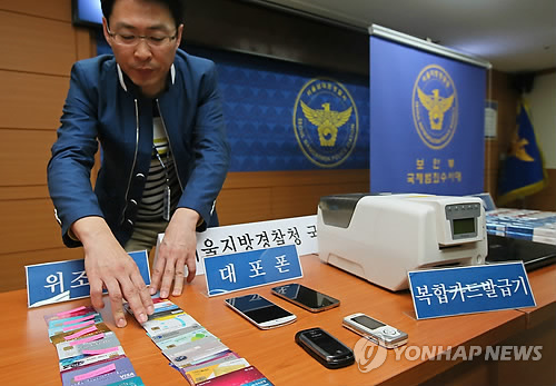 | △ 10대 신용카드 위조단 검거 (서울=연합뉴스) 박지호 기자 = 인터넷에서 불법 구매한 개인 정보를 이용해 신용카드를 복제·사용하고 위조 방법을 성인에게 전수한 10대들이 경찰에 붙잡혔다. 18일 오전 사건 담당 수사관이 서울 남대문경찰서에서 카드복제기 등 증거물을 공개하고 있다. |