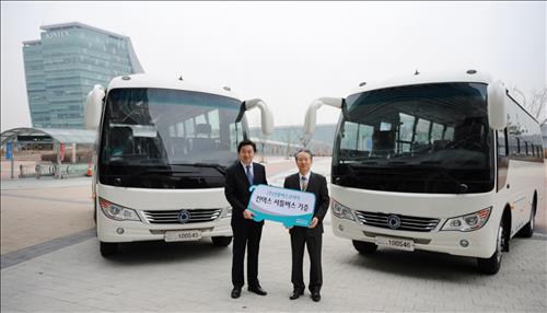 (서울=연합뉴스) 현윤경 기자 = 중국 버스인 선롱버스를 국내에 들여와 팔고 있는 선롱버스코리아가 18일 고양 킨덱스에 선롱버스 두에고EX 2대를 기증했다.