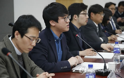 | △ 청년 과도기 노동실태와 대안 세미나 (서울=연합뉴스) 이상학 기자 = 18일 국회 의원회관에서 청년유니온 주최로 '청년 과도기 노동 실태와 대안' 세미나가 열리고 있다. 2015.3.18 leesh@yna.co.kr |