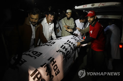 | △ 17일(현지시간) 파키스탄 페샤와르에서 병원 관계자들이 사미울라 아프리디 변호사의 시신을 구급차에 싣고 있다.(AP=연합뉴스) |