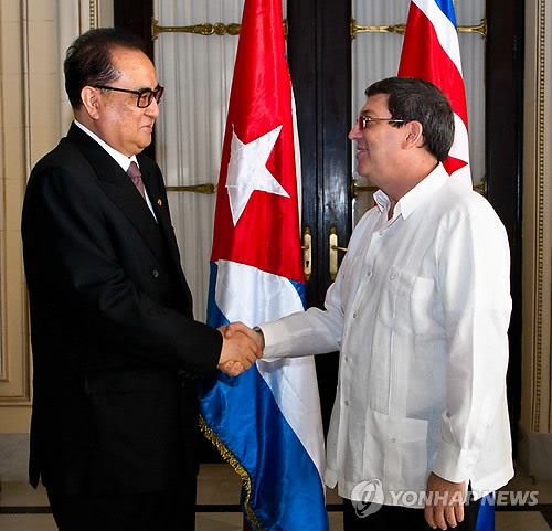 | △ North Korea's Foreign Minister Ri Su Yong, left, shakes hands with Cuba's Foreign Minister Bruno Rodriguez during a photo opportunity before their meeting in Havana, Cuba, Monday, March 16, 2015. (AP Photo/Liu Bin, Pool) |