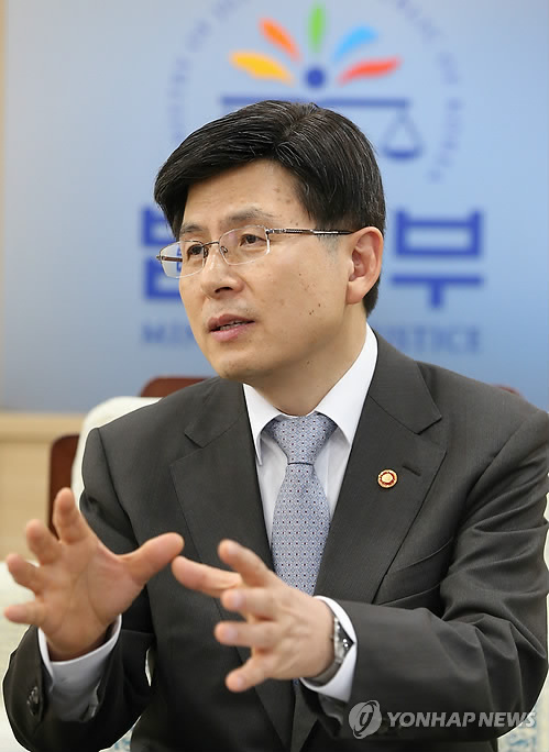 지난 11일로 장관 취임 2주년을 맞은 황 장관은 17일 연합뉴스와의 인터뷰에서 이같이 밝히면서 "(총리 담화 전) 검찰 인사 직후 비리와 안보위해세력에 대해 철저히 수사하라고 지시했다"며 "내가 아는 한 표적수사하는 일은 없다"고 말했다.