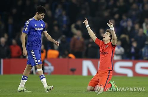 | △ 파리 생제르맹의 다비드 루이스(오르쪽)가 첼시의 디에고 코스타 옆에서 8강 진출을 기뻐하는 모습.(AP=연합뉴스DB) |
