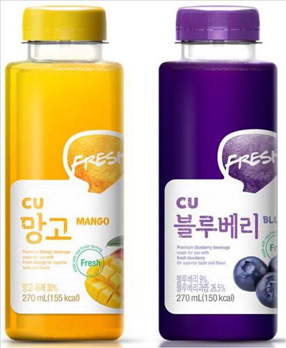 (서울=연합뉴스) 김희선 기자 = 편의점 씨유(CU)는 냉장 PB(자체상표) 음료인 'CU 망고'(270㎖/1천600원)와 'CU 블루베리'(270㎖/1천900원)를 19일 선보인다.