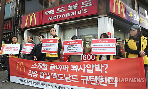 | △ 알바노조, 맥도날드 규탄 기자회견 (서울=연합뉴스) 김도훈 기자 = 19일 오전 서울 서대문구 맥도날드 홍제점 앞에서 알바노조 구교현 위원장이 맥도날드 규탄 기자회견을 하고 있다. 알바노조는 유연근로제를 채택하고 있는 맥도날드가 근로자의 스케줄을 줄이며 퇴사를 압박했다고 주장했다. 2015.3.19 superdoo82@yna.co.kr |