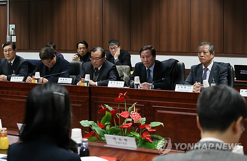 | △ 북한이 개성공단 북측 근로자의 임금 인상을 일방적으로 통보한 데 대한 대책회의가 5일 오후 서울 세종로 정부서울청사에서 열려 정기섭(오른쪽 두번째) 개성공단기업협회 회장을 비롯한 개성공단 입주 기업인들이 이강우 통일부 남북협력지구발전기획단장의 모두발언을 듣고 있다. |