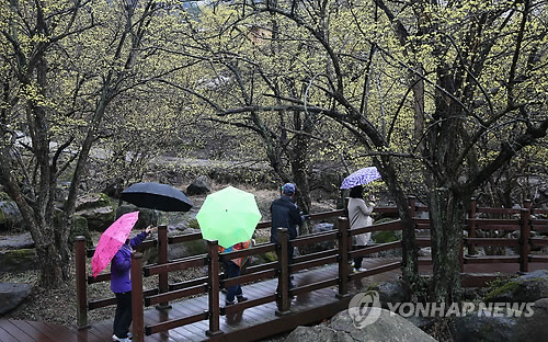 | △ 18일 전국적으로 내린 봄비가 55억원 이상의 경제적 가치가 있다는 분석이 나왔다. 사진은 봄비를 맞은 산수유꽃들이 전남 구례군 산동면 반곡마을 일대를 노랗게 물들이고 있는 모습. (구례군 제공) |