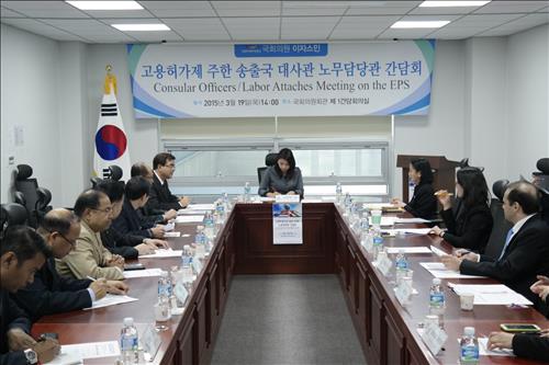 20일 새누리당 이자스민 의원실에 따르면 지난 19일 국회의원회관에서 열린 '고용허가제 주한 송출국 대사관 노무담당관 간담회' 참석자들은 미등록체류자를 줄이기 위해서는 미등록체류자를 고용한 사업주를 철저히 단속하고 엄중하게 처벌해야 한다는 데 공감했다.