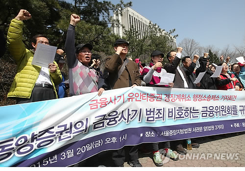 (서울=연합뉴스) 황철환 기자 = 동양피해자대책협의회는 20일 '동양그룹 사태'의 주범인 동양증권(현 유안타증권)에 대한 처분이 경징계에 그친 것을 받아들일 수 없다며 금융위원회를 상대로 행정소송을 제기했다.