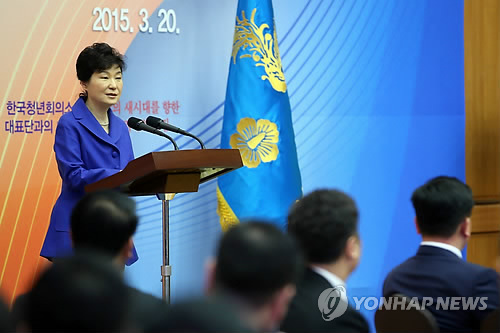 박 대통령은 이어 "분단 70년을 맞아 한반도 통일시대를 열어가는 것도 더이상 미룰 수 없는 역사적 과제"라며 "청년들이 나서서 통일을 연구하고 남북간 벽을 허물 수 있는 길을 찾는데 동참해주고, 적극적으로 통일사업을 펼쳐주기를 바란다"고 요청했다.