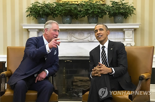 | △ 찰스 왕세자, 백악관 방문 (AP=연합뉴스) 미국을 방문 중인 영국 왕실의 찰스(왼쪽) 왕세자가 19일(현지시간) 워싱턴DC 백악관 집무실에서 버락 오바마 미 대통령과 대화하고 있다. |