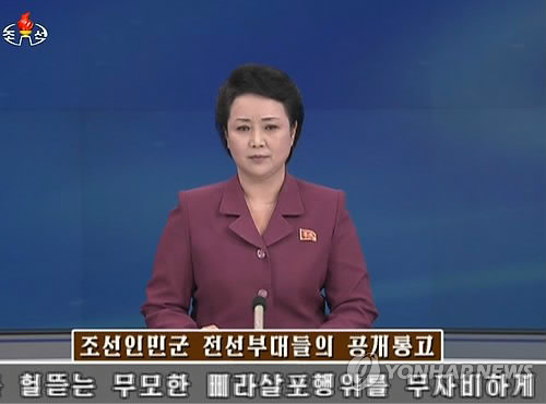 | △ 북한 "대북전단에 화력타격…주민대피 하라" (서울=연합뉴스) 북한은 22일 탈북자단체가 천안함 사건 5주기를 전후로 예고한 대북전단 살포에 대해 무력으로 대응하겠다는 뜻을 밝혔다. 북한은 이날 발표한 '조선인민군 전선부대들의 공개통고'에서 탈북자단체의 대북전단 살포 계획을 비난하며 "모든 타격수단들은 사전경고 없이 무차별적인 기구소멸작전에 진입하게 될 것"이라고 밝혔다고 조선중앙TV가 전했다. 이어 "삐라 살포에 대한 물리적 대응은 정정당당한 자위적 조치"라며 "물리적 대응 조치에 '원점타격' 등으로 도전해 나서는 경우 2차, 3차 징벌타격이 따르게 될 것"이라고 위협했다. 사진은 공개통고를 발표하는 중앙TV 아나운서 모습. |