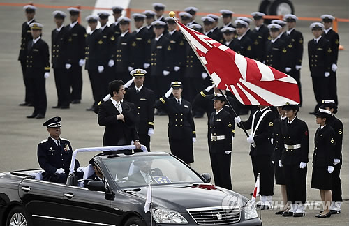 | △ 일본 연립여당인 자민·공명당이 합의한 안보법제 개정 방안은 일본이 공격받은 상황이 아니더라도 자위대가 언제 어디서든 미군 등 타국 군을 후방지원할 수 있도록 했다. 사진은 지난해 10월 26일 아베 신조 일본 총리가 자위대 창설 60주년을 기념해 이바라키현 오미타마의 햐쿠리 공군기지에서 항공자위대를 사열하고 있다. (연합뉴스 자료사진) |