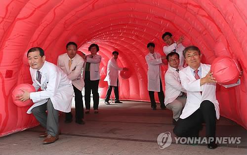 | △ 암으로 발전할 가능성이 큰 선종성 용종 환자의 절반이 40∼60대 중장년층 남성인 것으로 나타났다. 해당 사진은 지난해 대장항문학회 주최로 열린 '골드 리본 캠페인'에서 의사들이 대장 조형물에 들어가 용종 모형을 제거하고 있는 모습<<연합뉴스 자료사진>> |